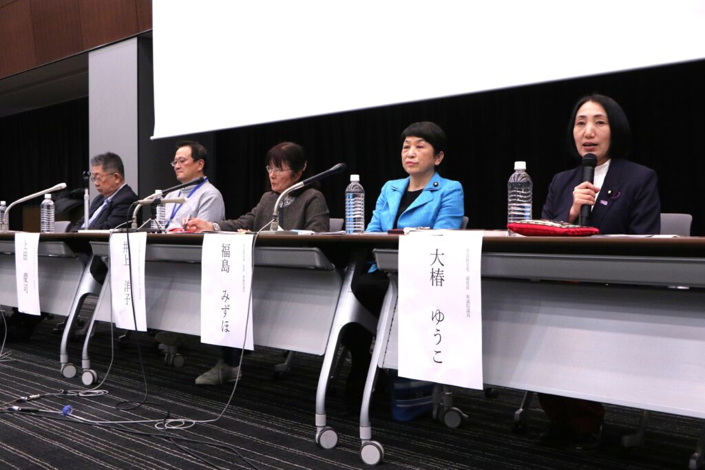 午後からは参議院議員会館講堂で、院内集会を行いました。192人収容の会場はほぼ満席になりました。国会議員は、大椿ゆうこ・福島みずほ党首の他、源馬謙太郎衆議院議員(立憲民主党)、高木真理参議院議員(立憲民主党)、石垣のりこ参議院議員(立憲民主党)、川田龍平参議院議員(立憲民主党)、小池晃参議院議員(日本共産党)が参加されました。