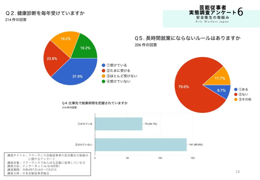 大椿ゆうこ/ 2021年4月1日、労災保険の特別加入(※一人親方や中小企業の経営者等、通常労災保険の対象にならない人が、年に一定の保険料を支払えば労災保険の給付を受けられるようになる制度)の対象拡大、及び2024年11月に施行された所謂フリーランス新法により、芸能従事者も労災保険に特別加入できるようになった。日本芸能従事者協会のアンケートによれば、仕事先で就業時間を把握されていないという人が65.9%、長時間就業にならないルールがないという人が79.6%となっている。芸能・芸術分野で働く方々の労働時間の把握は大変難しいと思うが、過労死等の事案に対する労災認定をするためには非常に重要である。これからフリーランスの芸能人の特別加入もますます増えてくると思うが、その人たちの労働時間をどのように把握しようと考えているか。